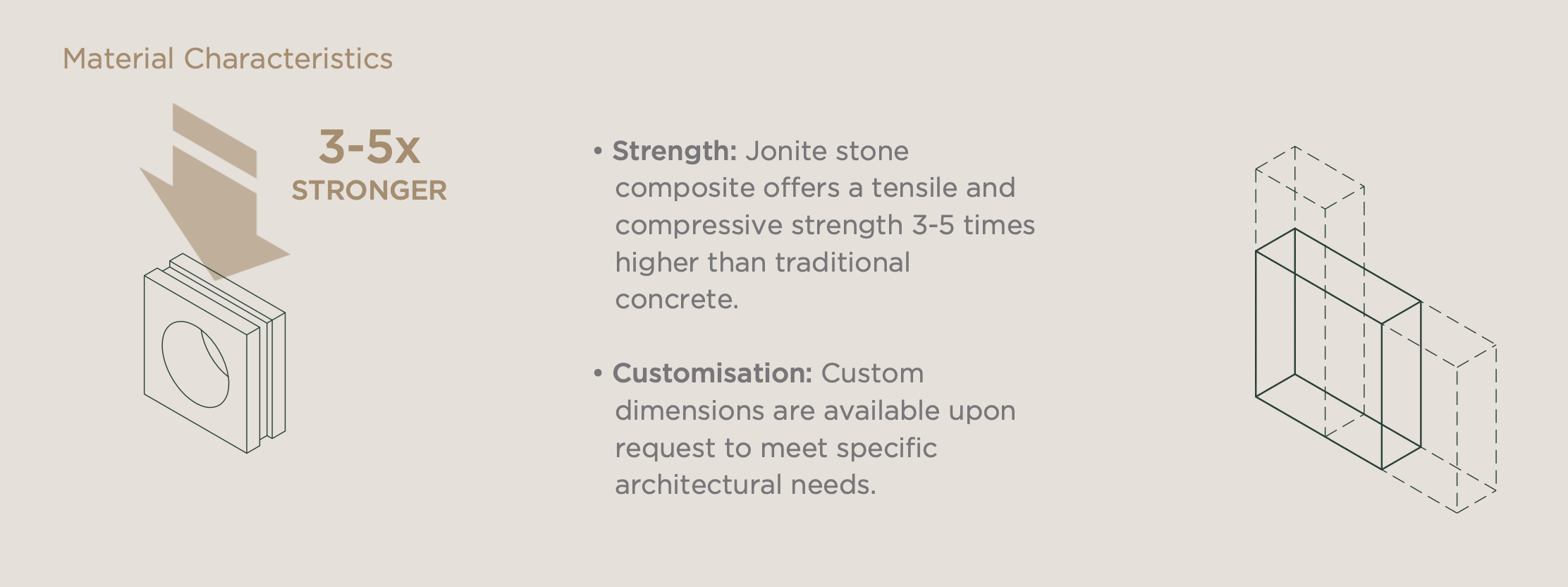 Jonite's stone composite technology boasts a remarkable 3-5 times higher tensile strength compared to standard concrete. This superior strength promises not only a durable installation but also significantly lesser chances of crack development over time. If your project calls for blocks of unique dimensions, Jonite’s customization options have got you covered. However, remember to place orders well in advance to ensure timely delivery and a smooth installation process.