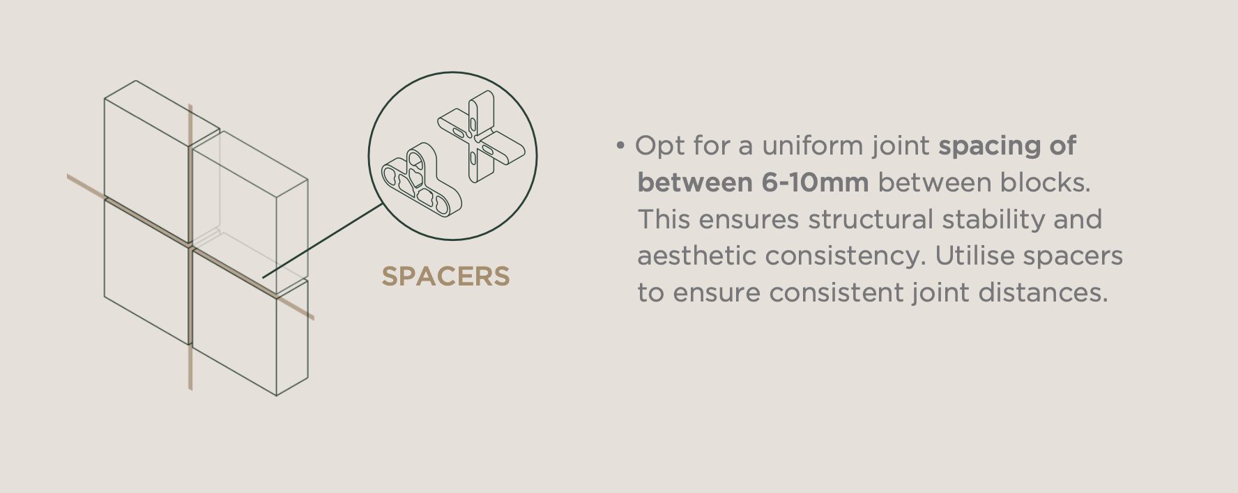Uniform joint spacing transcends as more than just an aesthetic requisite; it's a linchpin for the structural stability of the installation. Aiming for a uniform joint spacing of 3/8 inch between blocks is recommended, employing spacers if necessary to maintain this distance, thereby ensuring both structural integrity and a visually appealing finish.