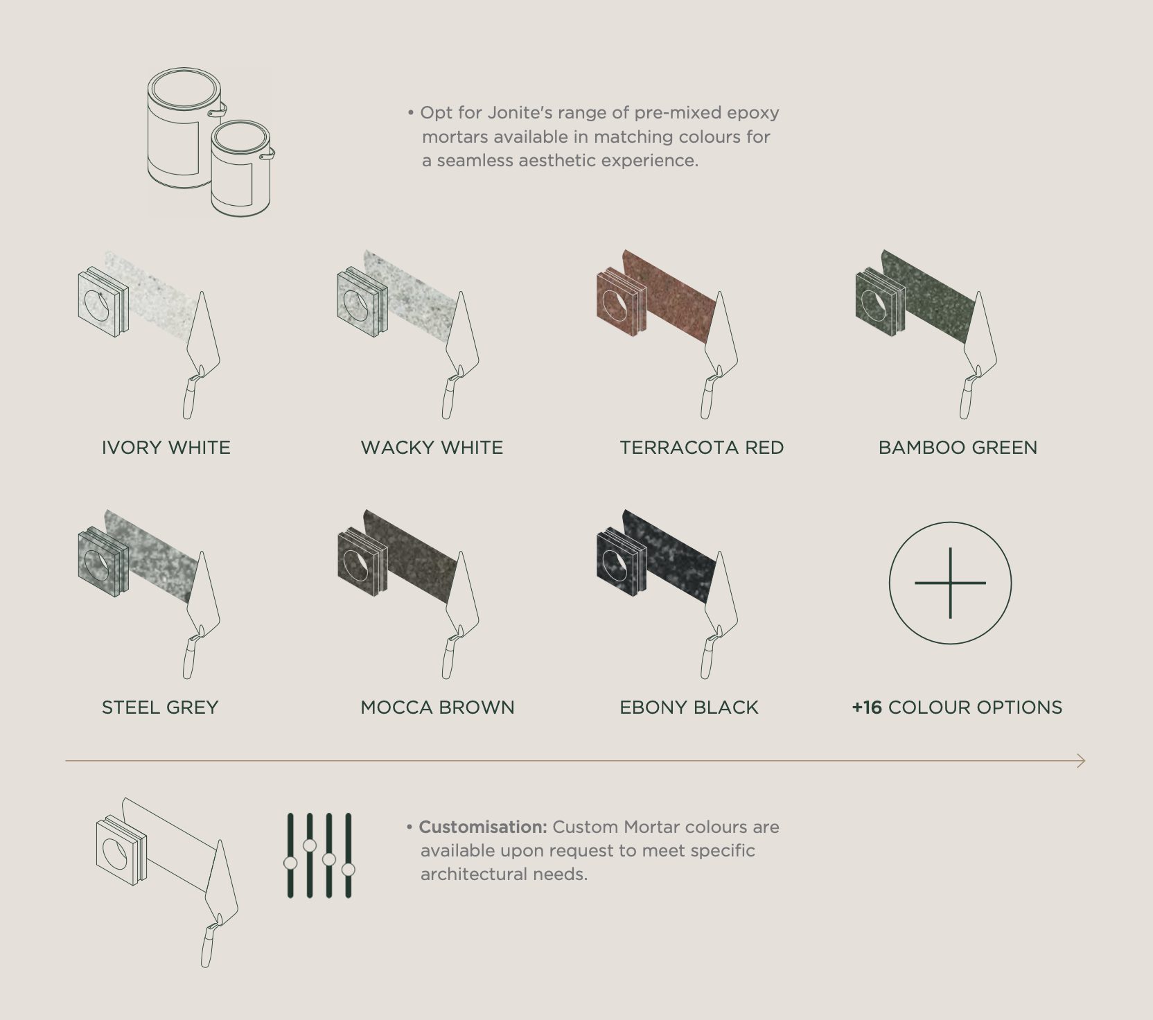 Jonite’s array of pre-mixed epoxy mortars come in a spectrum of colors designed to complement your Jonite Breeze Blocks. Choosing the right color not only enhances the aesthetic appeal but also allows for a harmonious blend with the surrounding architecture.
