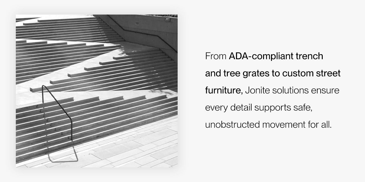 From ADA-compliant trench and tree grates to custom street furniture, Jonite solutions ensure every detail supports safe, unobstructed movement for all in the following ways:
