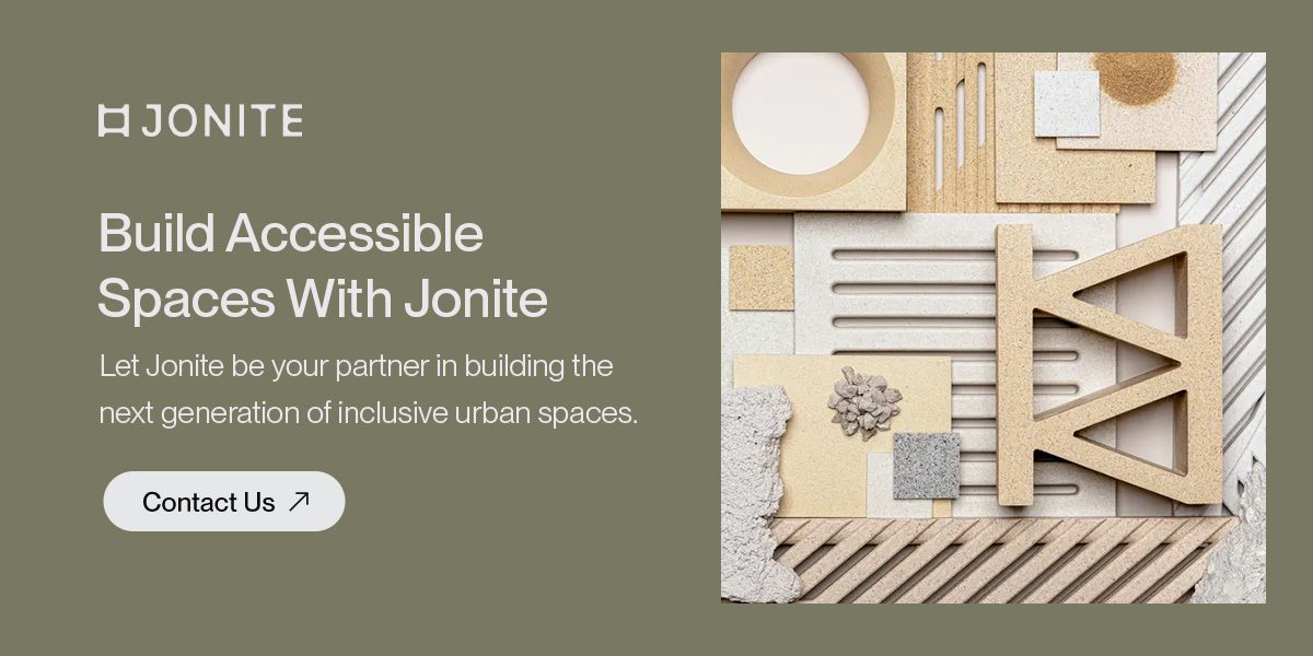 At Jonite, we believe inclusive urban design starts with the right materials and a partner who shares your vision for accessibility and beauty. For over 30 years, we’ve helped architects and landscape architects transform public spaces with products that set new standards for both compliance and creativity.