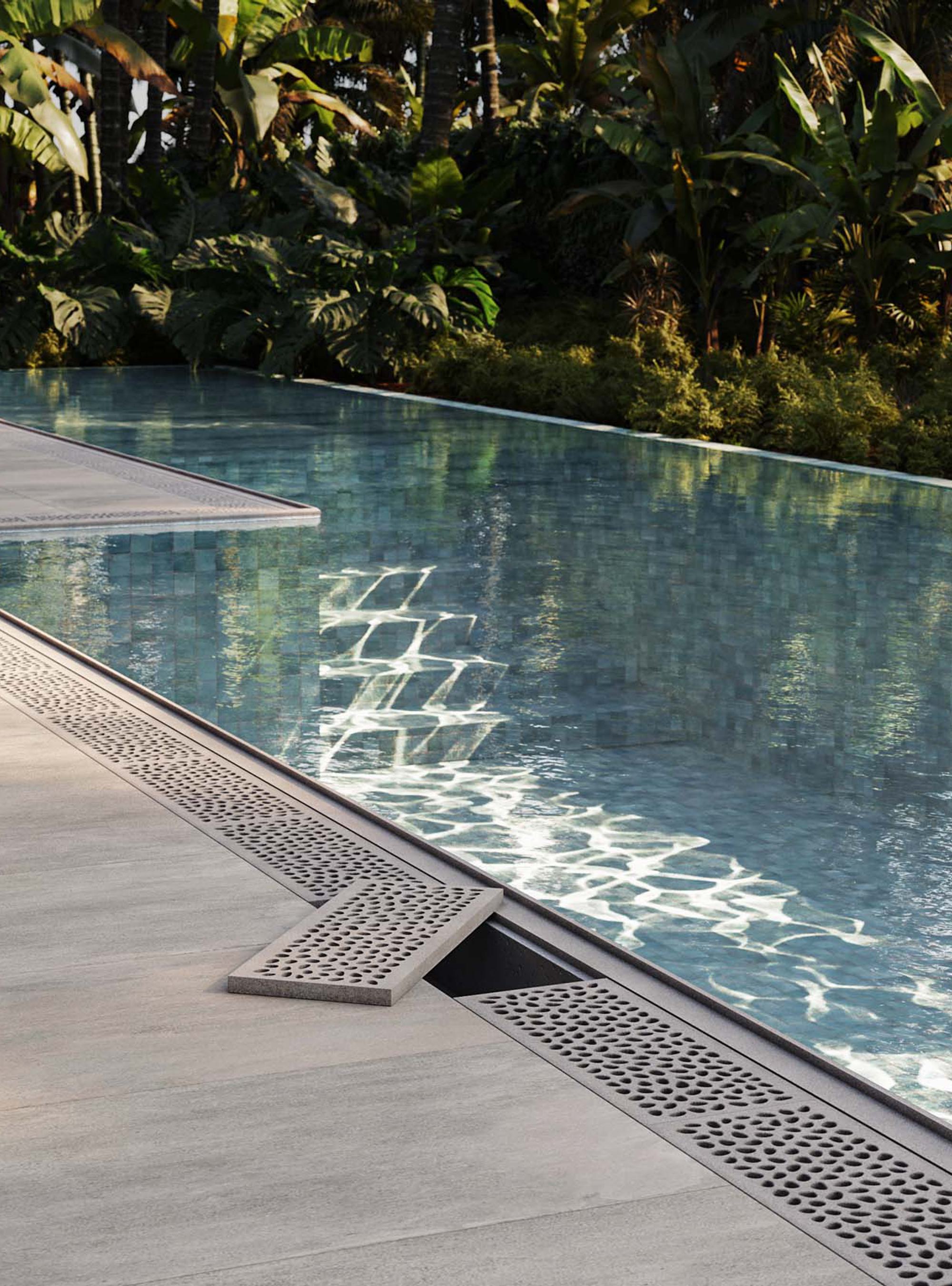 Slip resistance was especially critical in this installation, as the overflow pool design created consistently wet deck conditions with high foot traffic. Jonite’s grates provided not only the required anti-slip properties but also ensured an optimal flow rate to support effective water drainage and minimize splash accumulation—key performance aspects for the safety and comfort of residents.